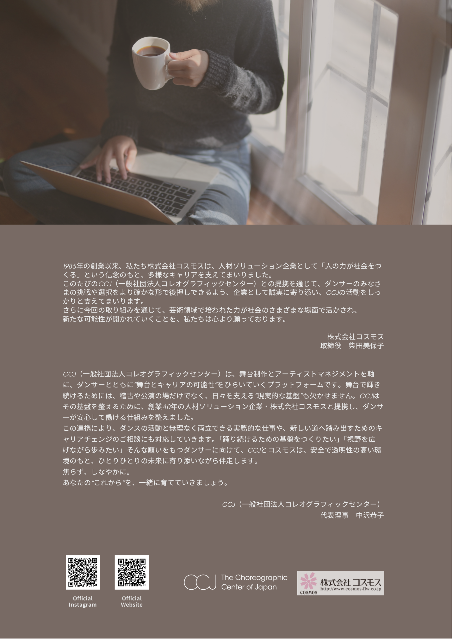 一般社団法人コレオグラフィックセンター(以下、CCJ)は、2026年1月より、株式会社コスモスと業務提携を締結し、ダンサーのキャリア支援事業を本格的に開始いたします。